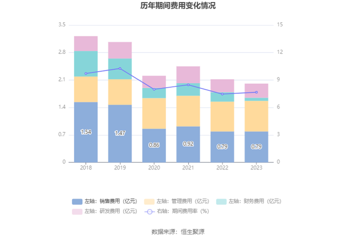 2023年,公司期间费用为2.01亿元,较上年同期减少1108.13万元;但期间费用率为7.67%,较上年同期上升0.20个百分点。其中,销售费用同比增长0.2%,管理费用同比增长2.73%,研发费用同比增长9.71%,财务费用同比下降68.17%。