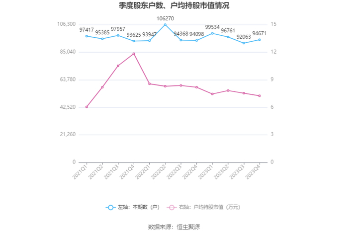 筹码集中度方面,截至2023年年末,公司股东总户数为9.47万户,较三季度末增长了2608户,增幅2.83%;户均持股市值由三季度末的7.54万元下降至7.26万元,降幅为3.71%。