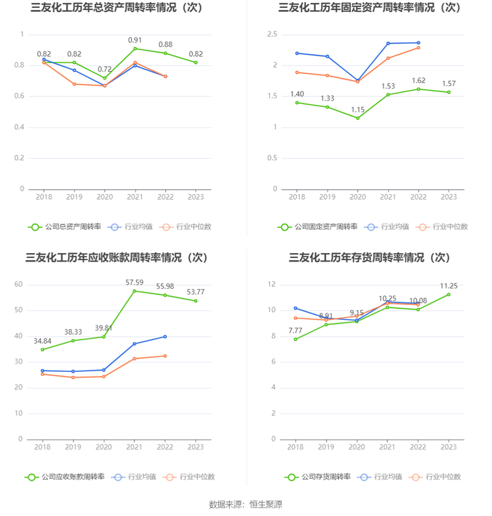营运能力方面,2023年,公司公司总资产周转率为0.82次,上年同期为0.88次(2022年行业平均值为0.73次,公司位居同行业18/58);固定资产周转率为1.57次,上年同期为1.62次(2022年行业平均值为2.37次,公司位居同行业43/58);公司应收账款周转率、存货周转率分别为53.77次、11.25次。