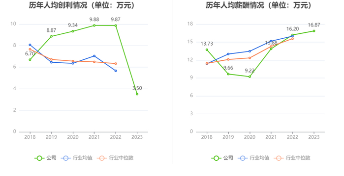 截至2023年末,公司员工总数为439人,人均创收151.95万元,人均创利3.50万元,人均薪酬16.87万元,较上年同期分别变化-20.72%、-64.50%、4.13%。