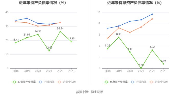 在偿债能力方面,公司2023年年末资产负债率为19.15%,相比上年末下降7.19个百分点;有息资产负债率为1.19%,相比上年末下降3.73个百分点。