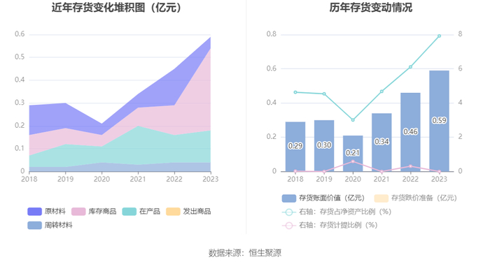 从存货变动来看,截至2023年年末,公司存货账面价值为5896.88万元,占净资产的7.92%,较上年末增加1341.47万元。其中,存货跌价准备为820.47元,计提比例为0.0%。