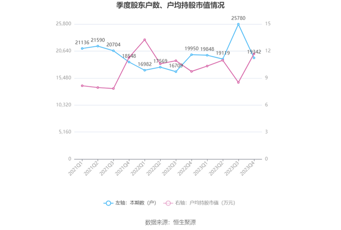 筹码集中度方面,截至2023年年末,公司股东总户数为1.93万户,较三季度末下降了6438户,降幅24.97%;户均持股市值由三季度末的8.52万元上升至11.70万元,增幅为37.32%。