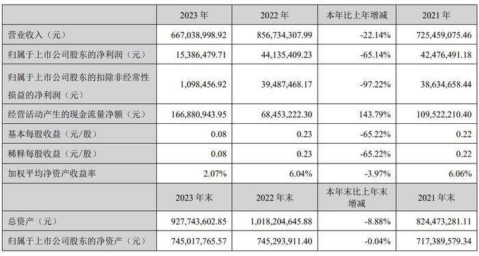 2023年,公司经营活动现金流净额为1.67亿元,同比增长143.79%;筹资活动现金流净额-5930.32万元,同比减少8689.52万元;投资活动现金流净额-4300.16万元,上年同期为-171.54万元。