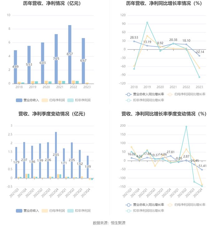 2023年,公司毛利率为51.19%,同比上升7.28个百分点;净利率为2.36%,较上年同期下降3.02个百分点。从单季度指标来看,2023年第四季度公司毛利率为61.08%,同比上升17.64个百分点,环比上升3.56个百分点;净利率为-6.74%,较上年同期下降16.04个百分点,较上一季度下降12.76个百分点。