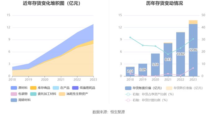 从存货变动来看,截至2023年年末,公司存货账面价值为12.86亿元,占净资产的30.65%,较上年末增加2.04亿元。其中,存货跌价准备为9270.97万元,计提比例为6.72%。