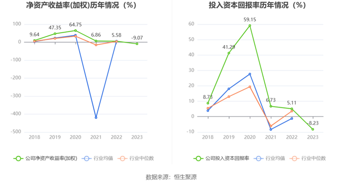 数据显示,2023年公司加权平均净资产收益率为-9.07%,较上年同期下降14.65个百分点;公司2023年投入资本回报率为-8.23%,较上年同期下降13.34个百分点。