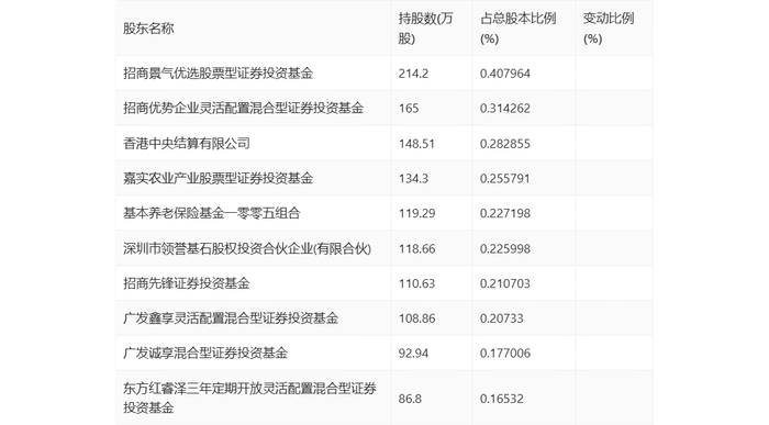 年报显示,2023年年末公司十大流通股东中,新进股东为招商景气优选股票型证券投资基金、招商优势企业灵活配置混合型证券投资基金、香港中央结算有限公司、嘉实农业产业股票型证券投资基金、基本养老保险基金一零零五组合、招商先锋证券投资基金、广发诚享混合型证券投资基金、东方红睿泽三年定期开放灵活配置混合型证券投资基金,取代了三季度末的银华农业产业股票型发起式证券投资基金、华夏基金-建设银行-中国人寿-中国人寿保险股份有限公司委托华夏基金管理有限公司中证全指组合、叶国良、赵昌苗、云南省投资控股集团有限公司、周开开、万华强、中国人寿保险股份有限公司-传统-普通保险产品-005L-CT001沪。在具体持股比例上,广发鑫享灵活配置混合型证券投资基金持股有所上升,深圳市领誉基石股权投资合伙企业(有限合伙)持股有所下降。