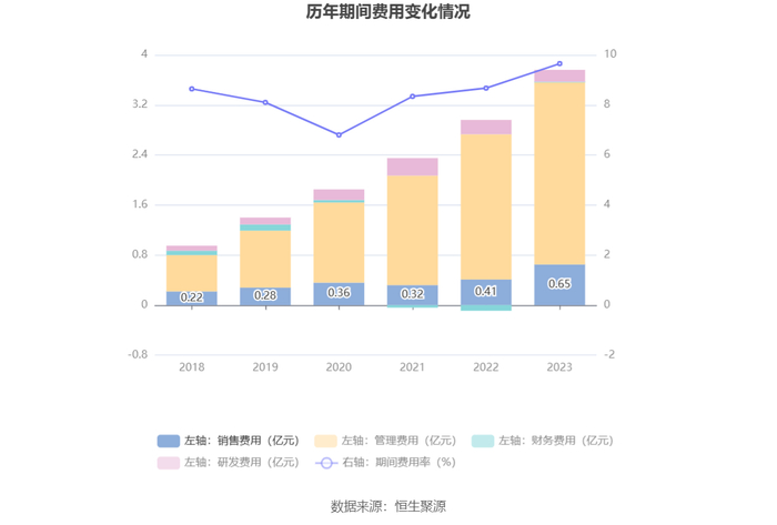 2023年,公司期间费用为3.76亿元,较上年同期增加8898.36万元;期间费用率为9.65%,较上年同期上升0.98个百分点。其中,销售费用同比增长60.23%,管理费用同比增长25.34%,研发费用同比下降18.73%,财务费用由去年同期的-918.23万元变为87.23万元。