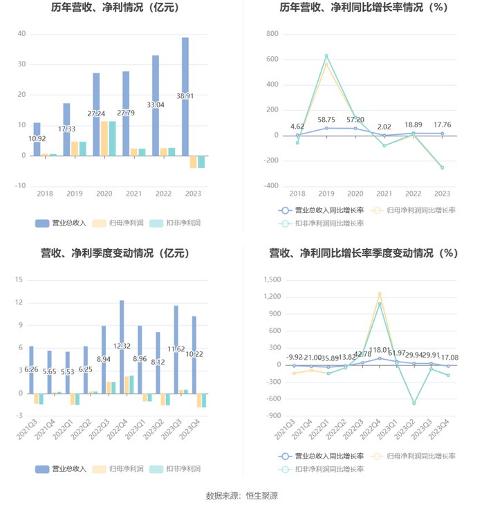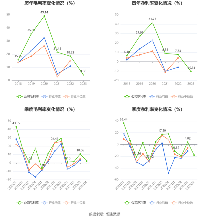 2023年,公司毛利率为4.38%,同比下降14.14个百分点;净利率为-10.31%,较上年同期下降18.04个百分点。从单季度指标来看,2023年第四季度公司毛利率为2.34%,同比下降26.81个百分点,环比下降8.32个百分点;净利率为-18.02%,较上年同期下降36.17个百分点,较上一季度下降22.04个百分点。