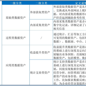 数据资产是能带来经济效益的数据资源。在当前数字化的浪潮下,数据已经成为继土地、劳动力、资本、技术之外的第五大生产要素,“数据就是资源”已成为共识。2021年12月,国务院发布《“十四五”数字经济发展规划》指出,数字经济“以数据资源为关键要素”,肯定数据资源的价值。根据《银行业数据资产估值指南》的定义,银行业数据资产为“银行业金融机构合法拥有或者控制的,能进行货币计量的,为组织带来直接或间接经济利益的可辨认数据资源”,具体又可分为:原始类数据资产、过程类数据资产、应用类数据资产。