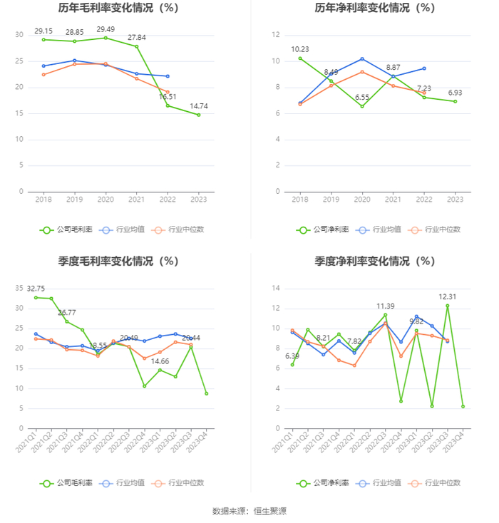 2023年,公司毛利率为14.74%,同比下降1.77个百分点;净利率为6.93%,较上年同期下降0.30个百分点。从单季度指标来看,2023年第四季度公司毛利率为8.77%,同比下降1.85个百分点,环比下降11.67个百分点;净利率为2.22%,较上年同期下降0.52个百分点,较上一季度下降10.09个百分点。