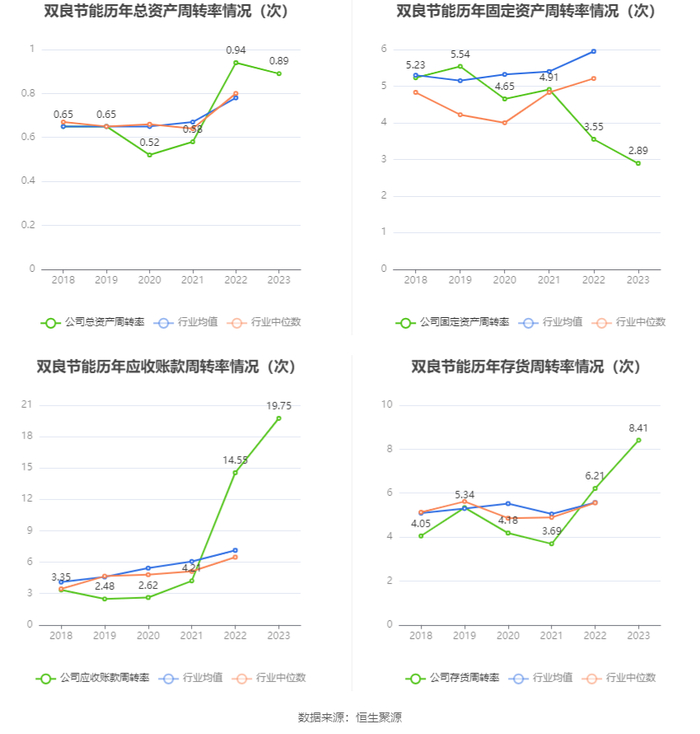营运能力方面,2023年,公司公司总资产周转率为0.89次,上年同期为0.94次(2022年行业平均值为0.78次,公司位居同行业25/63);固定资产周转率为2.89次,上年同期为3.55次(2022年行业平均值为5.95次,公司位居同行业44/63);公司应收账款周转率、存货周转率分别为19.75次、8.41次。