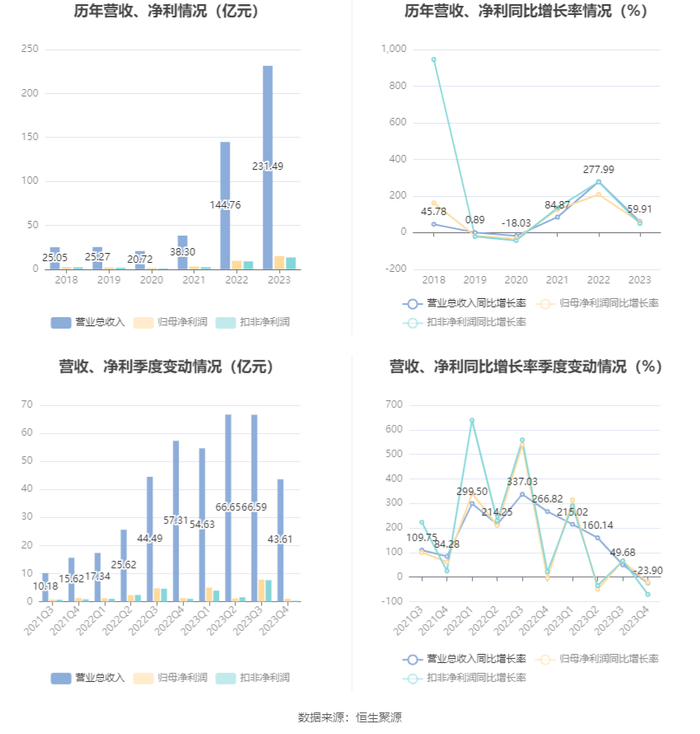 中证智能财讯 双良节能(600481)4月26日披露2023年年报。2023年,公司实现营业总收入231.49亿元,同比增长59.91%;归母净利润15.02亿元,同比增长57.07%;扣非净利润13.43亿元,同比增长49.53%;经营活动产生的现金流量净额为13.30亿元,上年同期为-34.17亿元;报告期内,双良节能基本每股收益为0.8027元,加权平均净资产收益率为21.15%。公司2023年年度利润分配预案为:拟向全体股东每10股派1.2元(含税)。