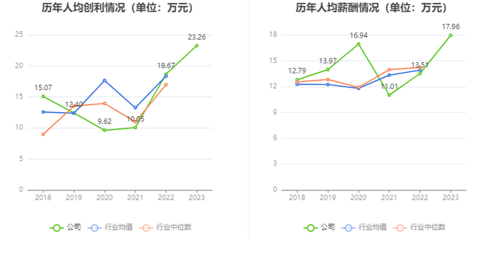 截至2023年末,公司员工总数为6455人,人均创收358.63万元,人均创利23.26万元,人均薪酬17.96万元,较上年同期分别增长26.84%、24.58%、32.87%。