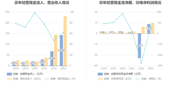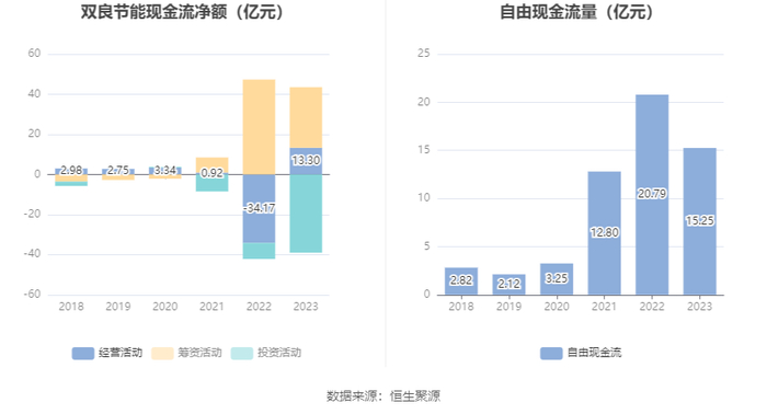 2023年,公司经营活动现金流净额为13.30亿元,同比增加47.48亿元;筹资活动现金流净额30.21亿元,同比减少17.09亿元;投资活动现金流净额-39.01亿元,上年同期为-7.99亿元。