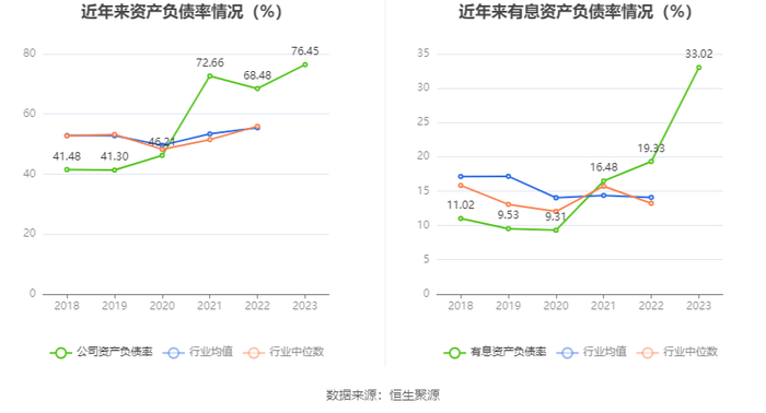 在偿债能力方面,公司2023年年末资产负债率为76.45%,相比上年末上升7.97个百分点;有息资产负债率为33.02%,相比上年末上升13.69个百分点。