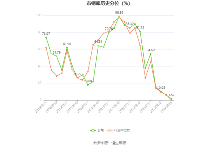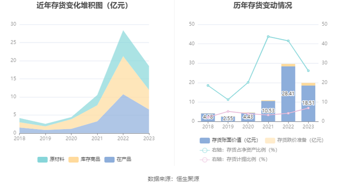 从存货变动来看,截至2023年年末,公司存货账面价值为18.51亿元,占净资产的26.16%,较上年末减少9.9亿元。其中,存货跌价准备为1.38亿元,计提比例为6.93%。