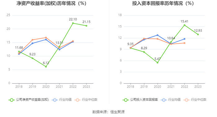 数据显示,2023年公司加权平均净资产收益率为21.15%,较上年同期下降0.95个百分点;公司2023年投入资本回报率为12.93%,较上年同期下降2.48个百分点。