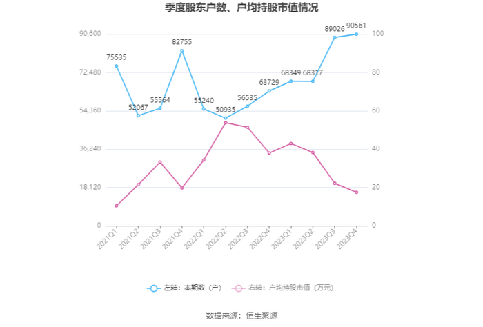 筹码集中度方面,截至2023年年末,公司股东总户数为9.06万户,较三季度末增长了1535户,增幅1.72%;户均持股市值由三季度末的22.21万元下降至17.48万元,降幅为21.30%。