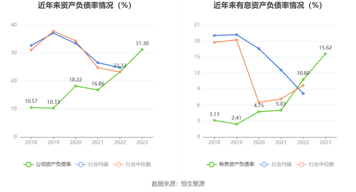 在偿债能力方面,公司2023年年末资产负债率为31.30%,相比上年末上升7.98个百分点;有息资产负债率为15.62%,相比上年末上升4.82个百分点。