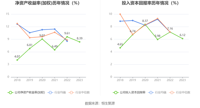 数据显示,2023年公司加权平均净资产收益率为8.39%,较上年同期下降1.22个百分点;公司2023年投入资本回报率为6.12%,较上年同期下降1.04个百分点。
