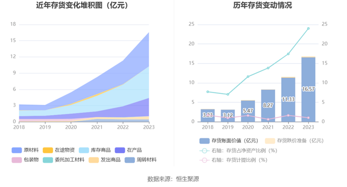 从存货变动来看,截至2023年年末,公司存货账面价值为16.57亿元,占净资产的23.99%,较上年末增加5.24亿元。其中,存货跌价准备为1763.44万元,计提比例为1.05%。