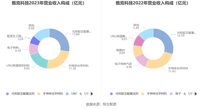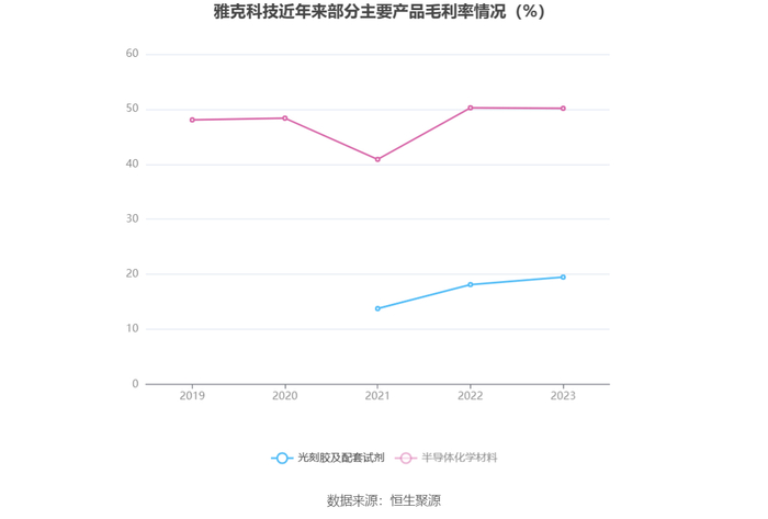 分产品看,光刻胶及配套试剂、半导体化学材料、LNG保温绝热材料2023年毛利率分别为19.47%、50.16%、34.90%。