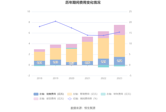 2023年,公司期间费用为7.31亿元,较上年同期增加1.39亿元;期间费用率为15.43%,较上年同期上升1.54个百分点。其中,销售费用同比增长26.8%,管理费用同比增长6.58%,研发费用同比增长48.78%,财务费用由去年同期的-4175.96万元变为-2254.22万元。