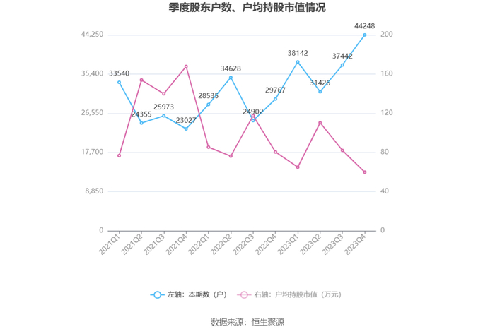 筹码集中度方面,截至2023年年末,公司股东总户数为4.42万户,较三季度末增长了6806户,增幅18.18%;户均持股市值由三季度末的82.11万元下降至59.94万元,降幅为27.00%。