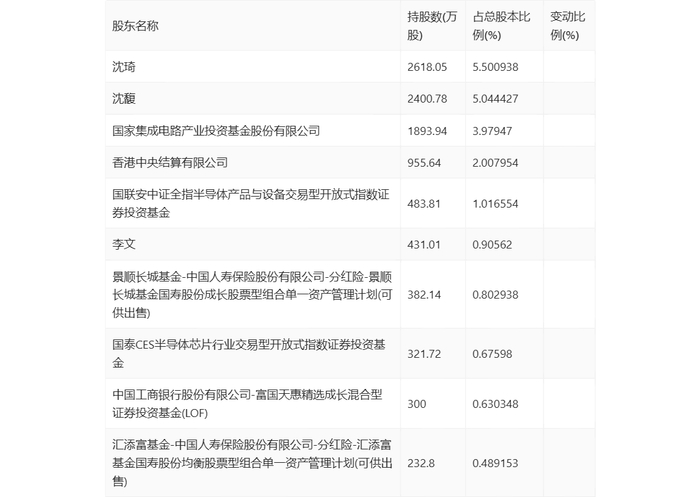 年报显示,2023年年末公司十大流通股东中,新进股东为中国工商银行股份有限公司-富国天惠精选成长混合型证券投资基金(LOF)、汇添富基金-中国人寿保险股份有限公司-分红险-汇添富基金国寿股份均衡股票型组合单一资产管理计划(可供出售),取代了三季度末的东志刚、景顺长城景气进取混合型证券投资基金。在具体持股比例上,香港中央结算有限公司持股有所上升,国家集成电路产业投资基金股份有限公司、国联安中证全指半导体产品与设备交易型开放式指数证券投资基金、李文、景顺长城基金-中国人寿保险股份有限公司-分红险-景顺长城基金国寿股份成长股票型组合单一资产管理计划(可供出售)、国泰CES半导体芯片行业交易型开放式指数证券投资基金持股有所下降。