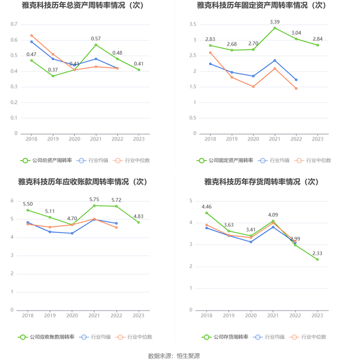营运能力方面,2023年,公司公司总资产周转率为0.41次,上年同期为0.48次(2022年行业平均值为0.42次,公司位居同行业8/19);固定资产周转率为2.84次,上年同期为3.04次(2022年行业平均值为1.73次,公司位居同行业5/19);公司应收账款周转率、存货周转率分别为4.83次、2.33次。