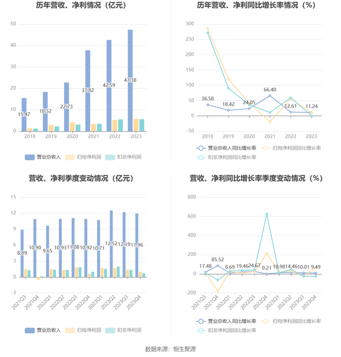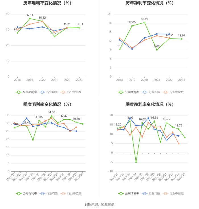 2023年,公司毛利率为31.33%,同比上升0.12个百分点;净利率为12.67%,较上年同期下降0.15个百分点。从单季度指标来看,2023年第四季度公司毛利率为29.73%,同比下降0.56个百分点,环比下降0.97个百分点;净利率为8.19%,较上年同期上升2.43个百分点,较上一季度下降4.54个百分点。