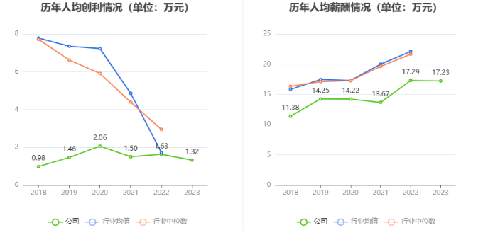 截至2023年末,公司员工总数为6234人,人均创收21.79万元,人均创利1.32万元,人均薪酬17.23万元,较上年同期分别变化0.77%、-19.05%、-0.38%。