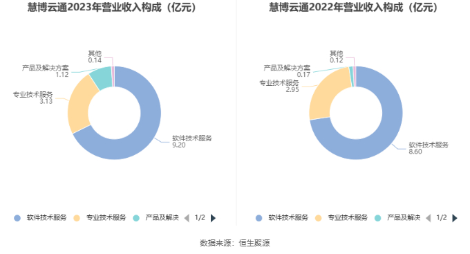分产品来看,2023年公司主营业务中,软件技术服务收入9.20亿元,同比增长6.97%,占营业收入的67.74%;专业技术服务收入3.13亿元,同比增长6.36%,占营业收入的23.06%;产品及解决方案收入1.12亿元,同比增长562.20%,占营业收入的8.21%。