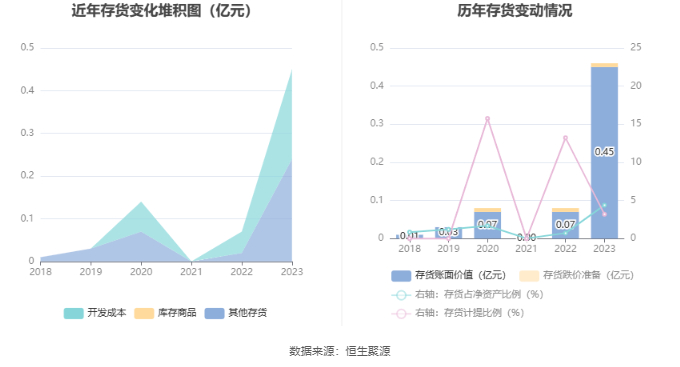 从存货变动来看,截至2023年年末,公司存货账面价值为4482.24万元,占净资产的4.39%,较上年末增加3785.19万元。其中,存货跌价准备为147.52万元,计提比例为3.19%。