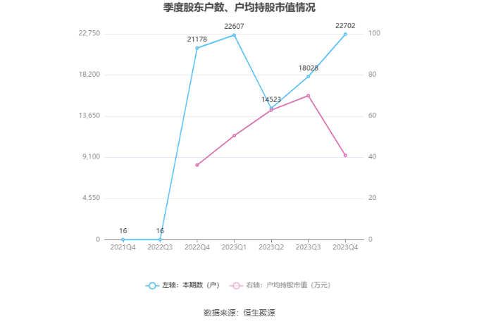 筹码集中度方面,截至2023年年末,公司股东总户数为2.27万户,较三季度末增长了4674户,增幅25.93%;户均持股市值由三季度末的69.96万元下降至40.95万元,降幅为41.47%。