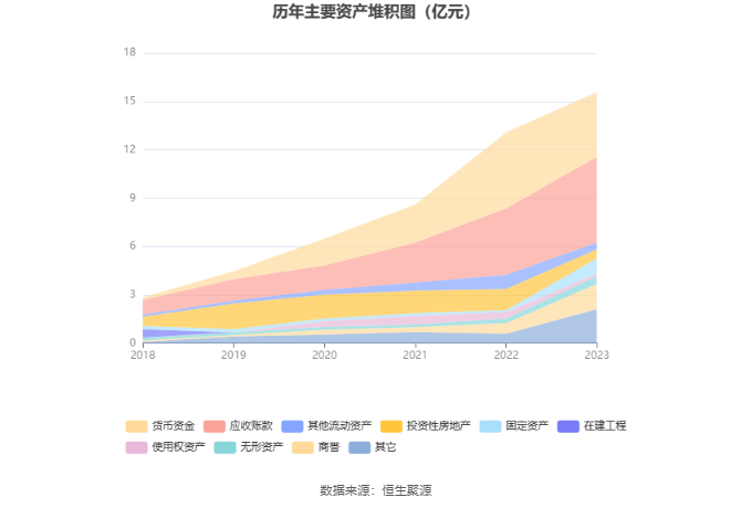 资产重大变化方面,截至2023年年末,公司货币资金较上年末减少14.46%,占公司总资产比重下降10.10个百分点;投资性房地产较上年末减少57.56%,占公司总资产比重下降6.45个百分点;固定资产较上年末增加592.91%,占公司总资产比重上升4.96个百分点;商誉较上年末增加133.93%,占公司总资产比重上升4.90个百分点。