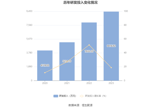 2023年全年,公司研发投入金额为9416.92万元,同比增长18.70%;研发投入占营业收入比例为6.93%,相比上年同期上升0.23个百分点。此外,公司全年研发投入资本化率为2.97%。