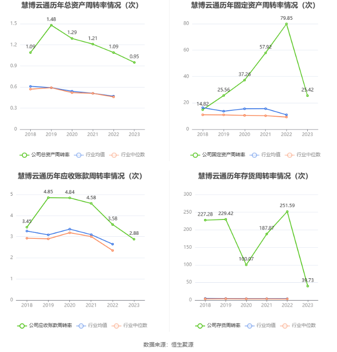 营运能力方面,2023年,公司公司总资产周转率为0.95次,上年同期为1.09次(2022年行业平均值为0.47次,公司位居同行业8/135);固定资产周转率为25.42次,上年同期为79.85次(2022年行业平均值为10.93次,公司位居同行业11/135);公司应收账款周转率、存货周转率分别为2.88次、39.73次。