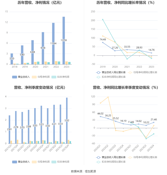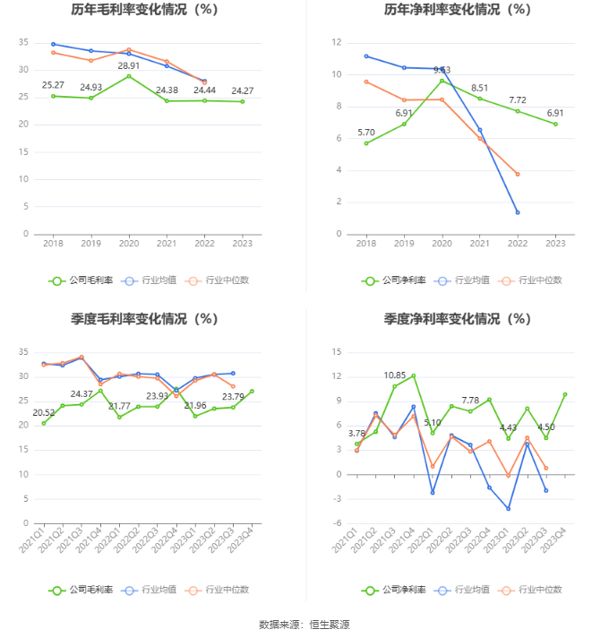 2023年,公司毛利率为24.27%,同比下降0.17个百分点;净利率为6.91%,较上年同期下降0.81个百分点。从单季度指标来看,2023年第四季度公司毛利率为27.09%,同比下降0.51个百分点,环比上升3.30个百分点;净利率为9.86%,较上年同期上升0.63个百分点,较上一季度上升5.36个百分点。