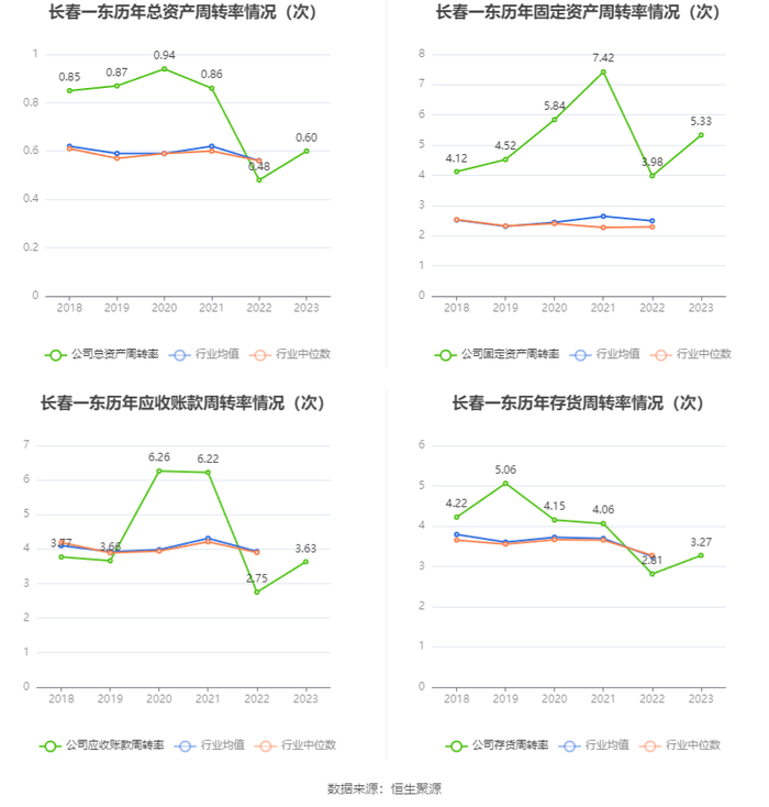 营运能力方面,2023年,公司公司总资产周转率为0.60次,上年同期为0.48次(2022年行业平均值为0.56次,公司位居同行业63/98);固定资产周转率为5.33次,上年同期为3.98次(2022年行业平均值为2.49次,公司位居同行业24/98);公司应收账款周转率、存货周转率分别为3.63次、3.27次。