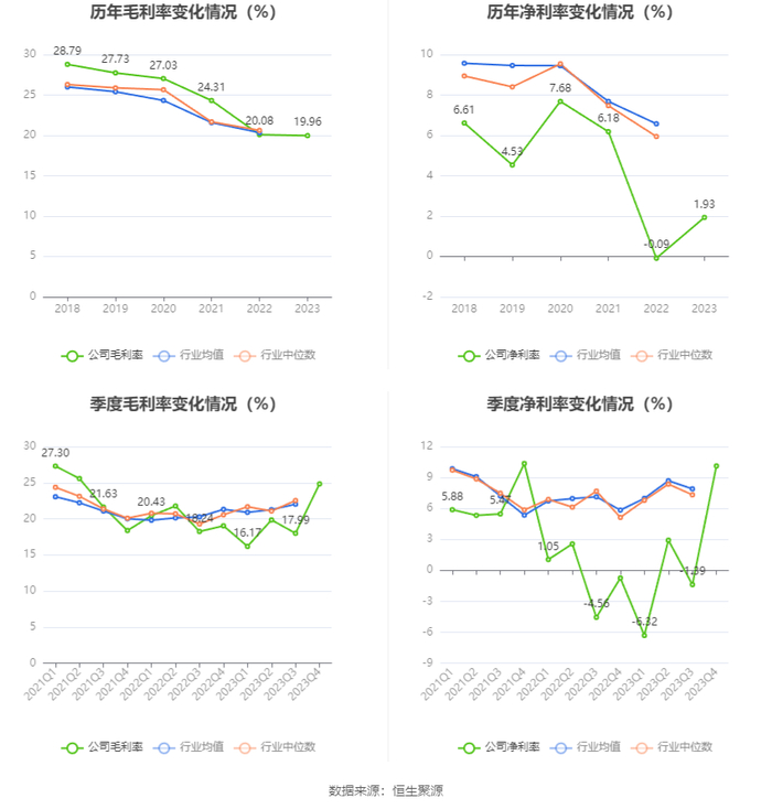 2023年,公司毛利率为19.96%,同比下降0.12个百分点;净利率为1.93%,较上年同期上升2.02个百分点。从单季度指标来看,2023年第四季度公司毛利率为24.83%,同比上升5.81个百分点,环比上升6.84个百分点;净利率为10.12%,较上年同期上升10.87个百分点,较上一季度上升11.51个百分点。