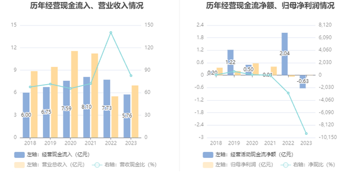 2023年,公司营业收入现金比为82.72%,净现比为-9498.10%。