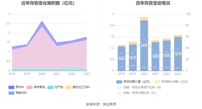 从存货变动来看,截至2023年年末,公司存货账面价值为1.8亿元,占净资产的38.26%,较上年末增加1928.76万元。其中,存货跌价准备为969.84万元,计提比例为5.11%。