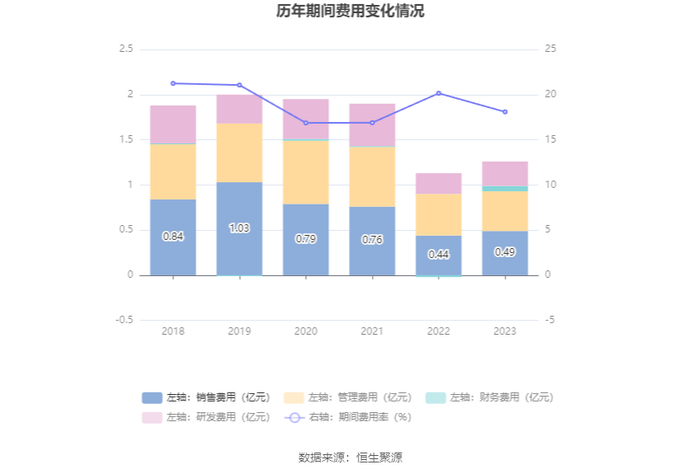 2023年,公司期间费用为1.26亿元,较上年同期增加1498.74万元;但期间费用率为18.09%,较上年同期下降2.06个百分点。其中,销售费用同比增长10.9%,管理费用同比下降4.01%,研发费用同比增长16.39%,财务费用由去年同期的-201.76万元变为617.44万元。
