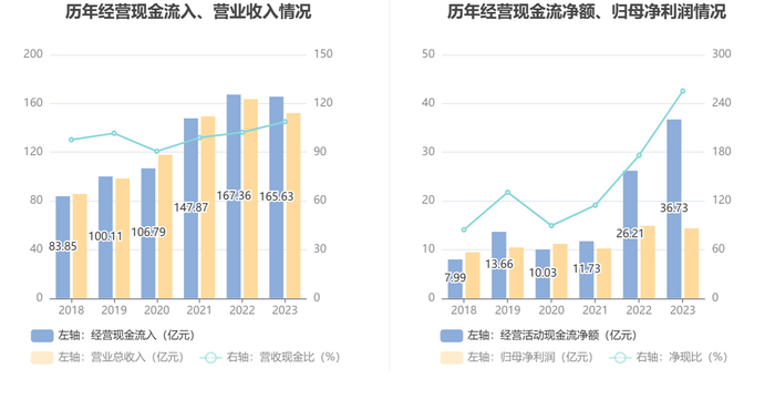 2023年,公司经营活动现金流净额为36.73亿元,同比增长40.17%;筹资活动现金流净额-15.97亿元,同比减少12.35亿元;投资活动现金流净额-19.27亿元,上年同期为-24.56亿元。