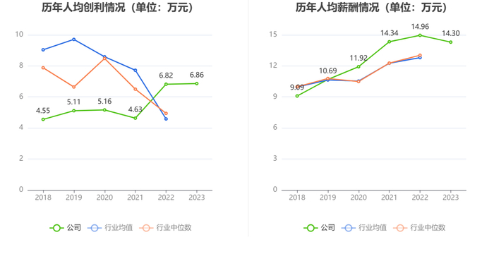 截至2023年末,公司员工总数为20966人,人均创收72.61万元,人均创利6.86万元,人均薪酬14.30万元,较上年同期分别变化-3.13%、0.64%、-4.45%。