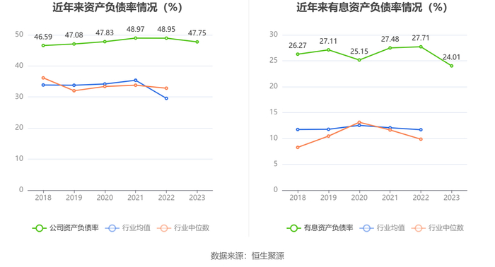 在偿债能力方面,公司2023年年末资产负债率为47.75%,相比上年末下降1.20个百分点;有息资产负债率为24.01%,相比上年末下降3.70个百分点。