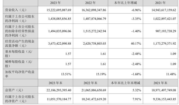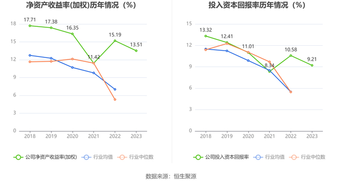数据显示,2023年公司加权平均净资产收益率为13.51%,较上年同期下降1.68个百分点;公司2023年投入资本回报率为9.21%,较上年同期下降1.37个百分点。